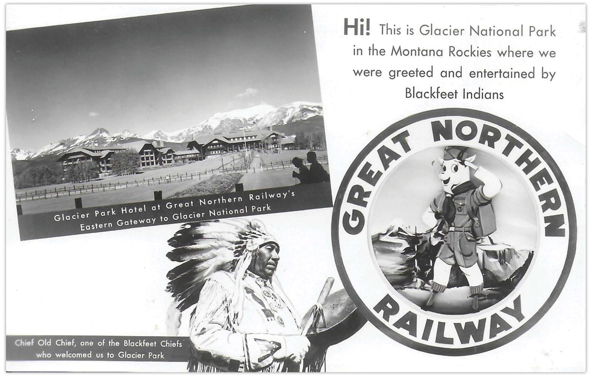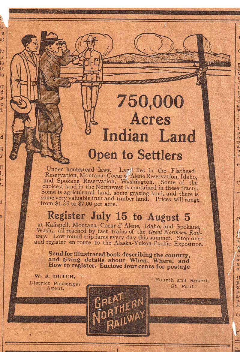 James J. Hill and his son, Louis W. Hill, along with many other powerful individuals during this time, also contributed to Native land dispossession. Specifically, James J. Hill and Louis W. Hill were able to leverage their relationships in Congress to take away land from Blackfeet Nation (in Montana). They lobbied for legislation that allowed them to build lodges near the railroad, which encouraged tourism that benefited the railroad. The legislation also facilitated settlement by non-Native people and transportation for the timber and mining industries, farming, and ranching. The railroad also leveraged the appeal of Blackfeet people and culture to promote tourism. Many white settlers gained profits, land, and opportunity.